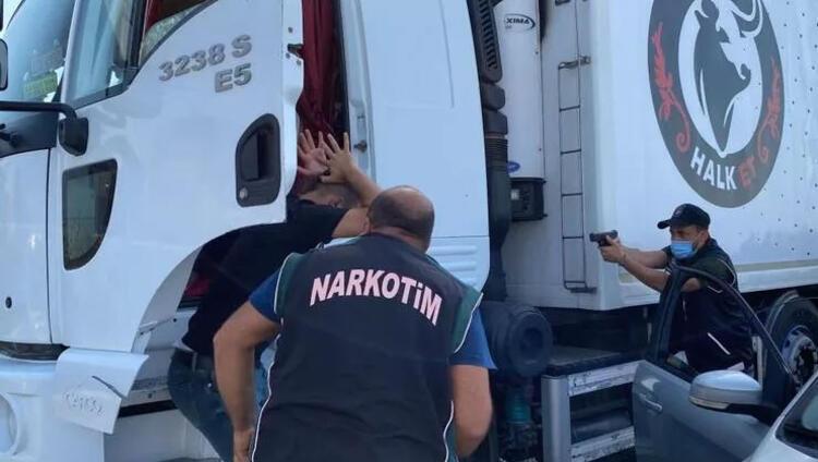 Öte yandan, kamyonun karadan ve havadan takibe alındığı operasyon kameraya yansıdı. Aracın durdurulması, sürücünün yakalanması, narkotik dedektör köpeğiyle kamyonda arama yapılması ve karkas etlerin arasında çuvallardaki esrar bulunması görüntülendi.